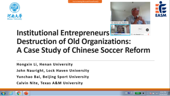 德赢winac米兰教师李鸿昕博士于北京时间9月24日晚在“Strategy, Leadership & Stakeholder Management in Sport”的专题研讨活动中就中国足球机制改革进行了“Institutional Entrepreneurs and the Destruction of Old Organizations: A Case Study of Chinese Soccer Reform”的研究报告,从制度理论的角度分析了中国足球改革面临的挑战及应对策略。