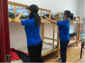 9月26日,志愿者服务部抵达营区,并按照第三营区(小学女子甲组)疫情防控规定认真做好各省代表队的接站工作。活动期间,志愿者部20名大姐姐除每日三次为营员测量体温外,还在学习和生活起居上担起重任,辅导她们作业,陪伴她们阅读,协助她们整理床铺、收拾房间,照顾受伤的小营员。