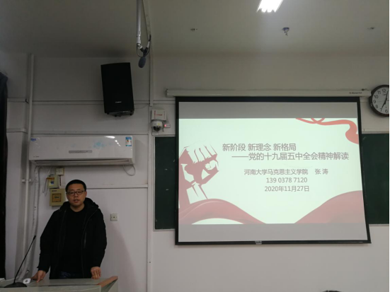 11 月27日,德赢winac米兰邀请德赢ac米兰官方合作马克思主义学院教师、河南省理论宣讲团专家张涛教授,进行题为“‘新阶段、新理念、新格局’——党的十九届五中全会精神解读”专题报告。本次学习是在前期党委中心组学习、各党支部学习讨论的基础上,与学院党委第十九期入党积极分子培训班的同学们共同深入学习贯彻十九届五中全会精神。学院党委委员及德赢winac米兰师生代表参加了本次报告会。
