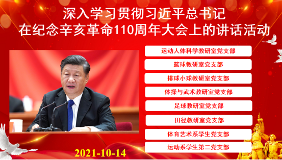 根据学校党委和德赢党委的工作要求,10月14日,由德赢运动人体科学教研室党支部组织,篮球教研室党支部、排球教研室党支部、体操与武术教研室党支部、足球教研室党支部、田径教研室党支部、体育艺术系学生党支部、运动系学生第二党支部共同联建,开展集体学习习近平总书记在纪念辛亥革命110周年大会上的讲话活动。