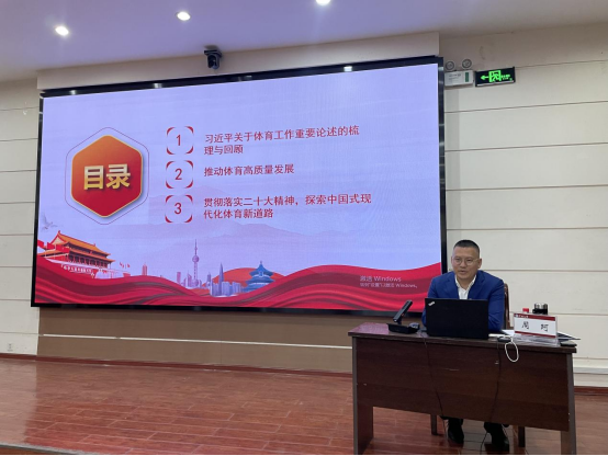 为全面贯彻落实二十大精神,紧紧围绕学习贯彻习近平新时代中国特色社会主义思想主题教育总要求,5月10日下午,德赢winac米兰院长、党委副书记周珂以“学习习近平关于体育的重要论述,推动体育高质量发展”为题,在电教室为学院广大师生上了一堂深入浅出、别开生面的主题党课。德赢ac米兰官方合作深入学习贯彻习近平新时代中国特色社会主义思想主题教育第一督导组组长闫峻同志,副组长、校党委教师工作部副部长赵炎同志,督导组成员、校纪委汪华同志莅临德赢监督指导,德赢winac米兰全体中层干部、党支部书记及委员,部分学生党员和发展对象代表参加会议。会议由德赢winac米兰党委副书记韩雪主持。