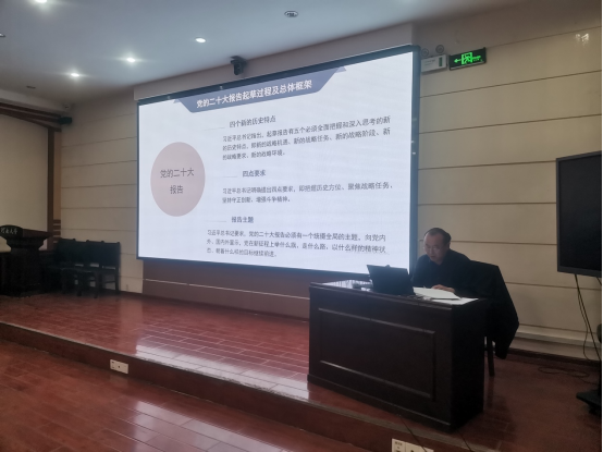 段廷良从教育现代化的历史演变、“两个一百年”奋斗目标的宏伟蓝图、二十大报告的起草过程及总体框架三个内容讲授第一部分内容。他提到,教育现代化的历史很长,最早可追溯到清朝末年。1921年中国共产党诞生后,我们党带领人民推翻了“三座大山”,成立了人民当家作主的中华人民共和国,我们才走上民族复兴的康庄大道。站在新征程新起点上,作为高等教育教师的各位更应该带头自信自强,守正创新,为实现中华民族伟大复兴而不懈奋斗。