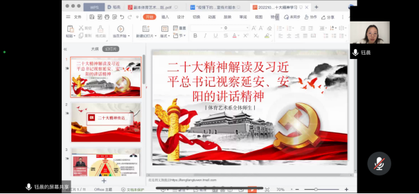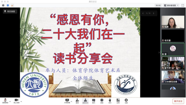 疫情防控当前,体育艺术系辅导员老师张笑笑、黄钰晨带领体育艺术系全体学生,于10月30日上午开展了以“感恩有你,二十大我们在一起”为主题的读书分享会。本次活动旨在弘扬中国特色社会主义思想,力做时代好青年;弘扬伟大抗疫精神和志愿精神,同心协力,共克时艰;在分享中讲好河大故事,彰显青年责任担当。