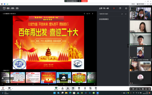 活动第三项由各年级年级长、副年级长及学生代表进行读书分享。读书分享主要围绕两大主题:党的二十大精神内涵;疫情下的生活。读书分享中既包含了作为当代青年对党的二十大精神的理解,也包含了处于疫情防控状态下的我们,对河大全体工作人员和志愿者的真心感谢。病毒无情,人间有爱,我们都相信,前路光明,星星点点的爱与希望定能帮助德赢ac米兰官方合作走出疫情雾霾,我们同舟共济,一切都会好起来,我们终会再次相见。