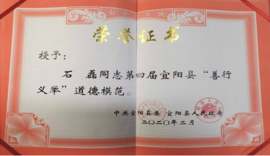 11月10日晚,第四届宜阳县道德模范颁奖典礼在宜阳县委党校多功能报告厅隆重举行。德赢2019级体育教育专业石磊同学勇救落水儿童被授予宜阳县“善行义举”道德模范荣誉称号。