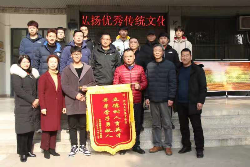 12月10日上午,落水儿童家长专程向德赢winac米兰赠送锦旗—— “立德树人育英才,莘莘学子勇救人”,表达了对德赢和学生石磊的感谢。学院党委书记牛娴、院长张大超、党委副书记王建国、副院长周珂、体育系主任贾亮及石磊的部分同学出席此次锦旗赠送仪式。