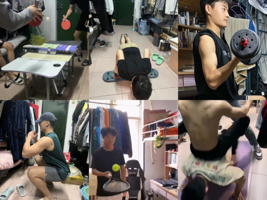 疫情生活也让学生们感受到学校和老师们浓浓的爱意,通过教师们的身体力行体会“百折不挠、自强不息”的河大精神,师生间情感连结更深刻,同学间的革命友谊也更加牢固。三餐的规律饮食与作息下,同学们们自发在宿舍开始体能锻炼。大家脑洞大开,以凳子为球桌,用娃娃当“舞伴”,充满创意又物尽其用的运动方式,不仅达到了良好的锻炼目的,也为生活增添不少乐趣。
