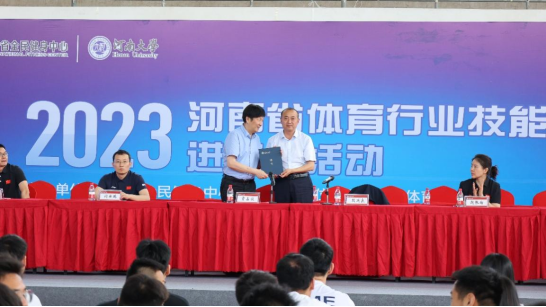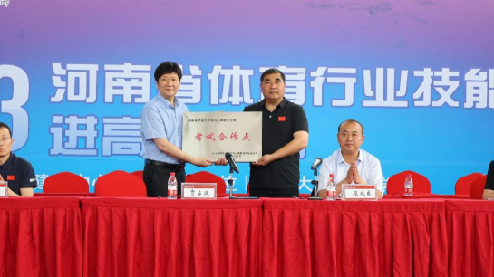 期间段廷良向贾占波颁发德赢winac米兰客座教授聘书。贾占波向德赢winac米兰授予河南省体育行业特有工种职业资格考试合作点牌匾。