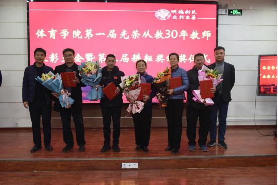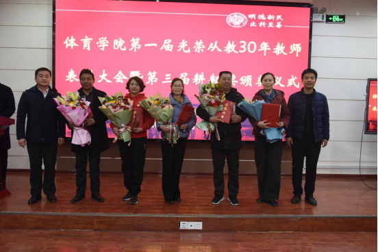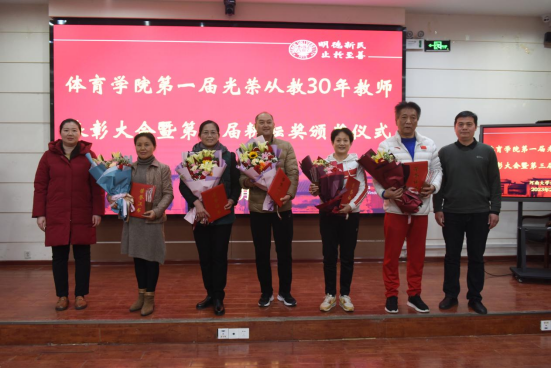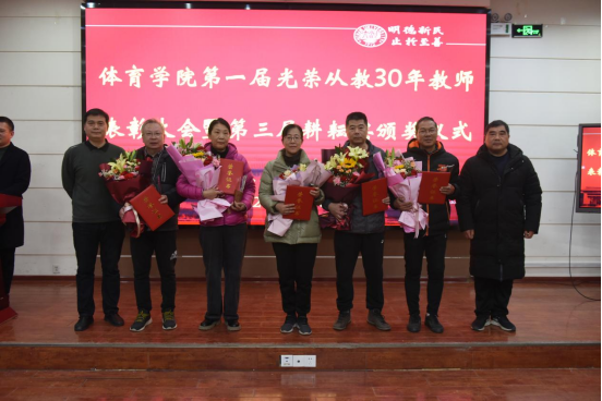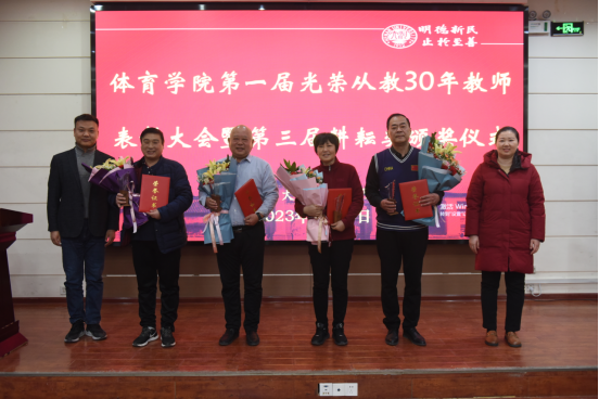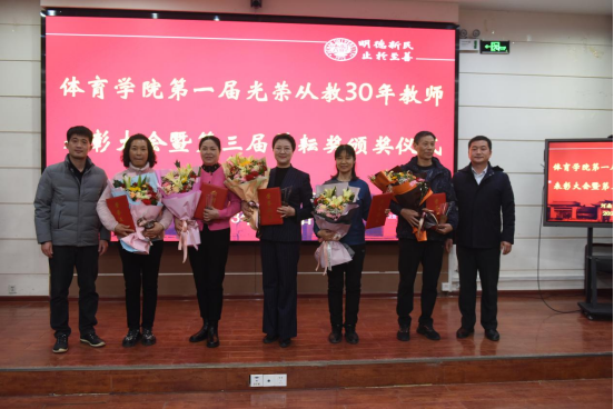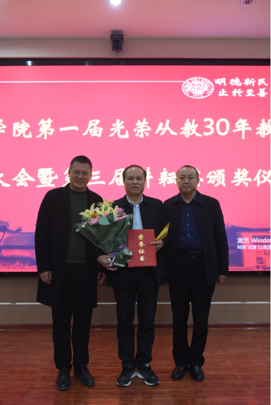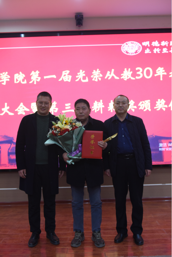 随后在欢快的音乐声中,学院班子全体成员依次为从教30年以上的在岗一线教师们进行表彰和为2022年荣休教师们颁发耕耘奖,学院新入职青年教师为获表彰老师们献上鲜花。