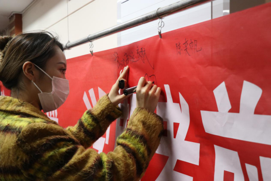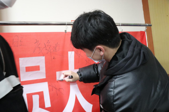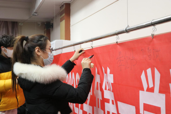 大会第四项,由刘昶老师带领同学们集体在条幅上进行诚信考试承诺签名。