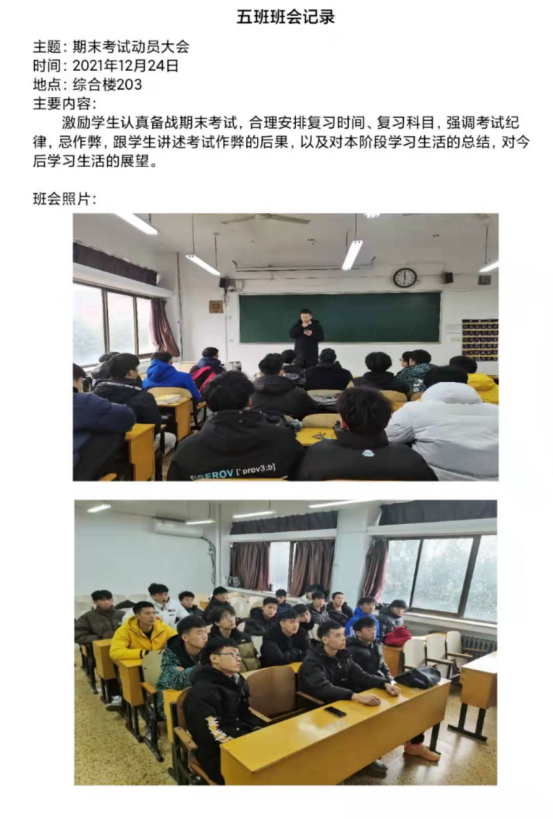 本次大会严格遵循疫情防控需要,所以大会结束后由各年级班干部对所属班级进行上传下达、上情下达,各自在本班组织一次期末考试考前动员主题班会,班会内容和主题紧靠本次大会;既保证了疫情防控常态下的要求,又做到了人人知情、人人参与的大会目的。