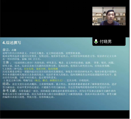 会议开始,付晓男同学进行了简单的自我介绍并分享了自己的学术成果。付晓男,国家中级游泳社会体育指导员,入学以来参与2022年度开封市哲学社会科学课题并结项,以第二作者发表SCI一篇,多次参加国内学术会议专题口头汇报,并在2022-2023学年获得硕士国家奖学金,硕士学业一等奖学金、“优秀研究生”称号。其次,他依靠个人经验就文献综述的定义、特点、类型及如何撰写进行了详细的讲解,建议大家用文献综述的方法写论文,同时,向学弟学妹们分享了他在学习时如何挖掘核心内容以及探索个人学习领域的视野等学习技能。最后,他用流程表为大家展示了自己的时间规划,建议大家要将复杂的学习流程简化,并制定相应的短期、长期目标,使自己的学习、生活按照计划有条不紊的进行。