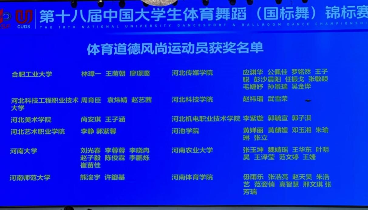 德赢ac米兰官方合作体育舞蹈代表队在院领导的大力支持下,由德赢winac米兰党委书记段廷良担任领队,艺术系主任张笑笑担任教练员,参加了本届中国大学生体育舞蹈(国标舞)锦标赛。在六天的赛程中,队员们凭借扎实的专业功底与充满激情的舞台演绎,赢得了观众与评委的一致赞誉。历经预赛、复赛、半决赛、决赛的层层激烈比拼,最终斩获一项冠军、一项季军,以及两项第四、一项第五、一项第六、一项第七、一项第八的优异成绩,展现出德赢ac米兰官方合作代表队的风采及拼搏精神。此外,德赢ac米兰官方合作荣获“体育道德风尚运动队”,教练员张笑笑获“体育道德风尚教练员”称号,队员刘光春、李蓉蓉、李晓冉、赵子毅、陈俊霖、李鹏烁、崔苗佳获“体育道德风尚运动员”称号。