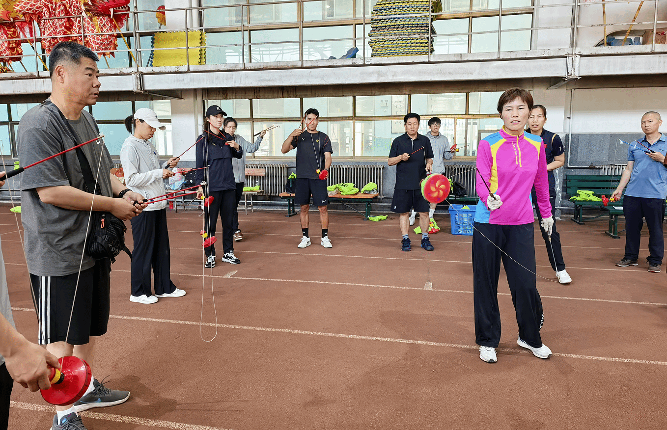 空竹技能培训在田径馆进行, 冯艳丽示范行云流水般的抖空竹技法,学员在老师的带领下快速掌握基础动作,感受非遗魅力 。