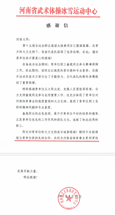 赛后,河南省武术体操冰雪运动中心特向金龙副教授发来感谢信,对其在全运会裁判工作中的专业贡献以及长期以来对河南武术事业发展的支持表示高度认可。