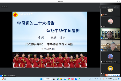 为深入学习贯彻习近平新时代中国特色社会主义思想,提高德赢师生整体科研素养,12月2日晚7点,特邀武汉德赢winac米兰黄莉教授作《学习党的二十大报告弘扬中华体育精神》讲座。讲座采用线上方式进行,由德赢winac米兰院长周珂教授主持。 黄莉教授从中华体育精神的历史发展和主要内涵出发,详细解读了中华体育精神的内容、价值以及未来的发展,提出了中华体育精神的定位;接着,黄教授从不同角度去解读习近平总书记体育强国的论断,提出要把...