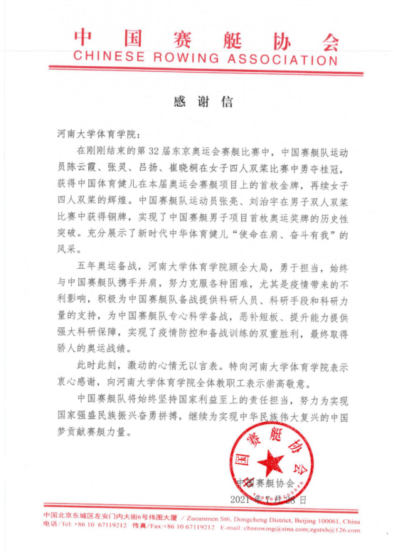 在刚刚结束的第32届东京奥运会赛艇比赛中,中国赛艇队在女子四人双桨比赛中勇夺桂冠,获得中国体育健儿在本届奥运会赛艇项目上的首枚金牌;在男子双人双桨比赛中获得铜牌,实现了中国赛艇男子项目首枚奥运奖牌的历史性突破。赛后,中国赛艇协会向德赢发来感谢信。对学院在五年东京奥运备战期间为中国赛艇队提供的科研人员、科研手段和科研力量支持以及为中国赛艇队专心科学备战,恶补短板、提升能力提供的强大科研保障,表示衷...